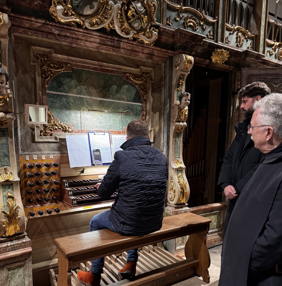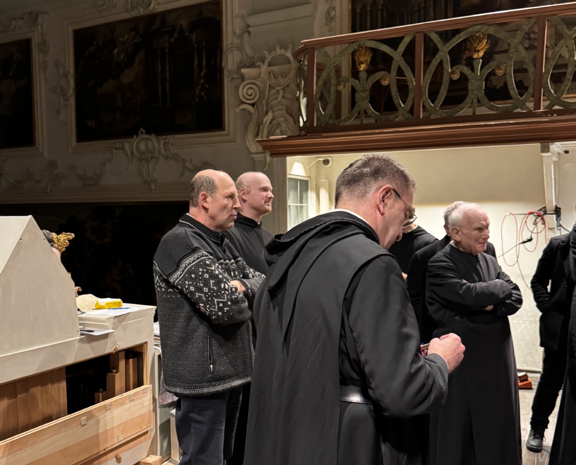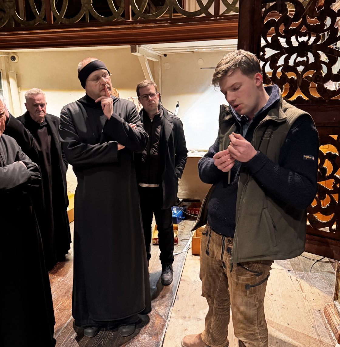 Für den Konvent war das Anlass genug, sich das neue Instrument zeigen und erklären zu lassen. Orgelbaumeister Hendrik Ahrend, sein Sohn Paul Ahrend und Stiftskapellmeister Peter Peinstingl erklärten das Konzept der Orgel und führten in die Grundlagen des Orgelbaus ein. Unter anderem erläuterten sie den Aufbau der Orgel, was Intonieren bedeutet und wie die Pfeifen hergestellt und gebaut sind. Bevor es zur Besichtigung in die Orgel ging, griff Stiftskapellmeister Peter Peinstingl in die Tasten und stellte die Orgel klanglich vor. Der Klang der neuen Orgel war bewegend und erhebend und zauberte sichtlich ein Strahlen in die Gesichter des Konvents.